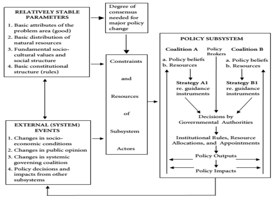 Enquanto processo natural de contenda política, enquanto espaço limitado para implementação de políticas públicas, verifica-espaço limitado para implementação de políticas públicas, verifica-se que um subsistema político apresenta uma diversidade de Ad- vocacy Coalitions, que competem por influências ou pelo processo de tomada de decisões. Ademais, as coalizões políticas aprendem com a observação de mudanças e feedbacks enquanto estratégias de orientação de coligações, compreensão do mundo e dos objetivos políticos. (PARSONS, 1996, p. 198).