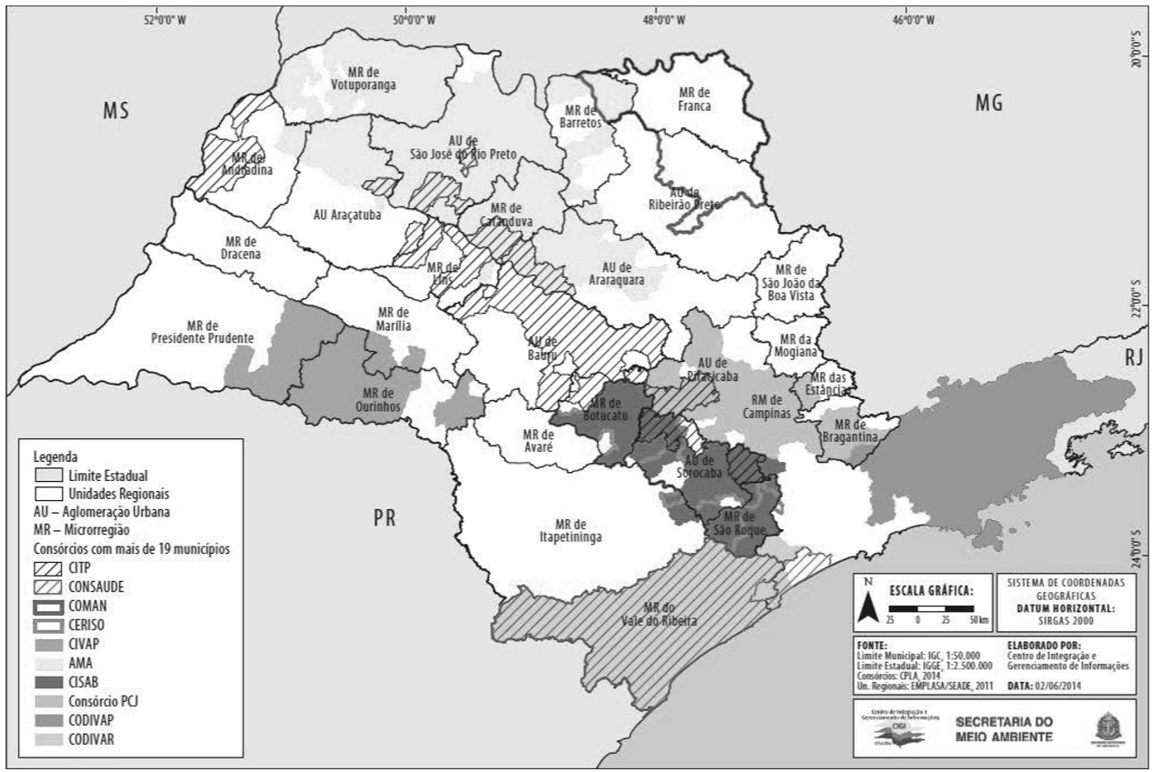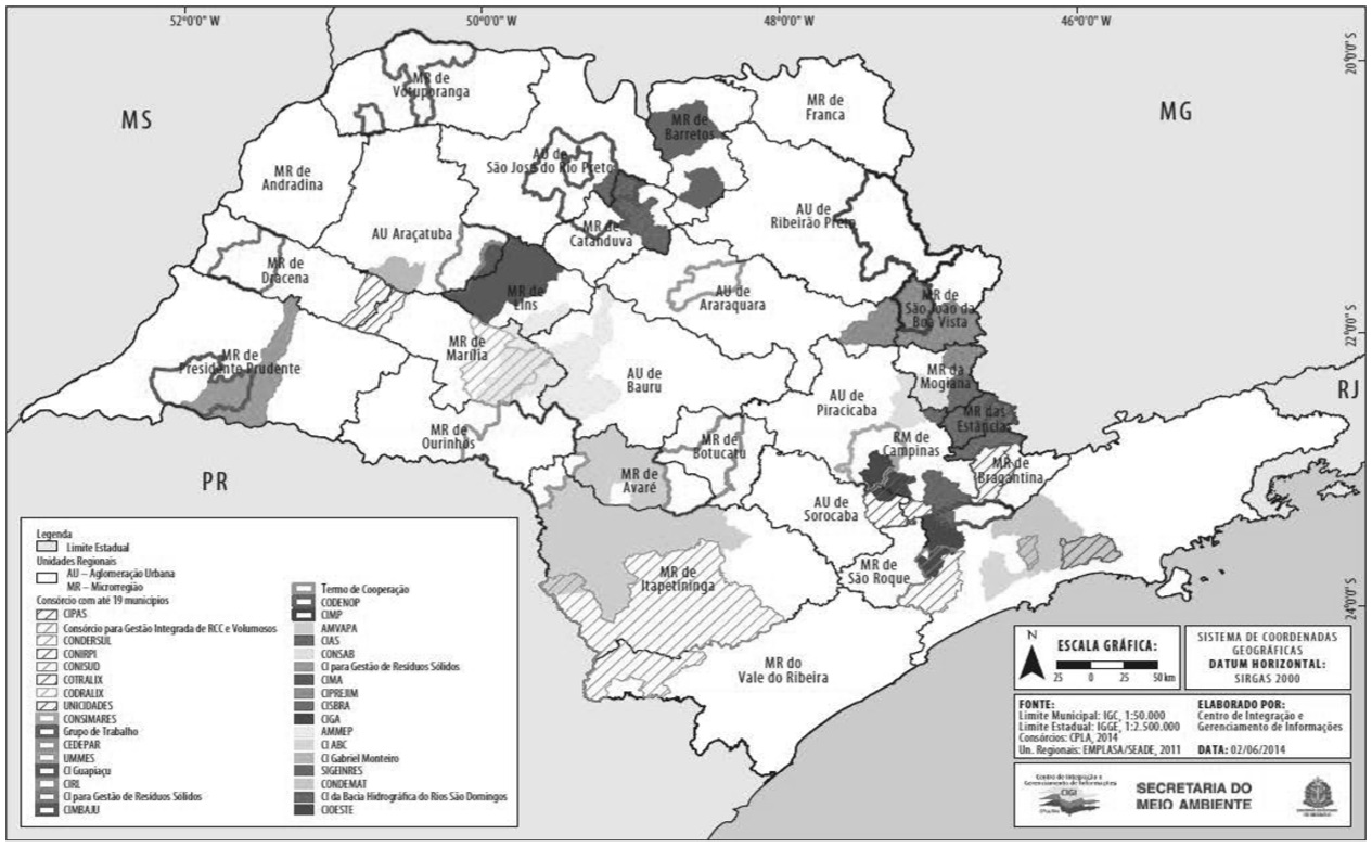 O Plano de Resíduos Sólidos do Estado de São Paulo (PRS-SP) apresentou um levantamento de 2012 referente a todos os con- sórcios públicos do Estado de São Paulo. (SMA, 2014). O resultado foi apresentado em dois mapas (dos consórcios com até 19 municípios e dos consórcios de mais de 19 municípios) e estão reproduzidos nas Figuras 2 e 3 respectivamente.