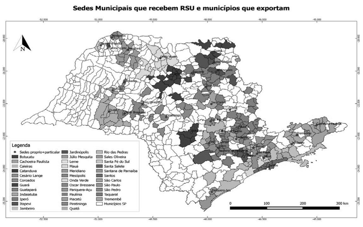 Destaca-se, assim, a distribuição geográfica dos municípios que dispõem seus resíduos em Piratininga, Guatapará e Caieiras. Dos treze municípios que dispõem em Piratininga, o município de Lins dista aproximadamente 122 km do aterro. Dos dezenove que dispõem em Guatapará, o município de Águas de Prata dista aproxi- madamente 189 km. Por fim, dos municípios que dispõem em Caiei- ras, os localizados no Vale do Ribeira como Iguape, Ilha Comprida e Sete Barras ficam a uma distância média aproximada de 220 km do local de destinação final. (SÃO PAULO, 2016). A disposição atual está apresentada na Figura 7.