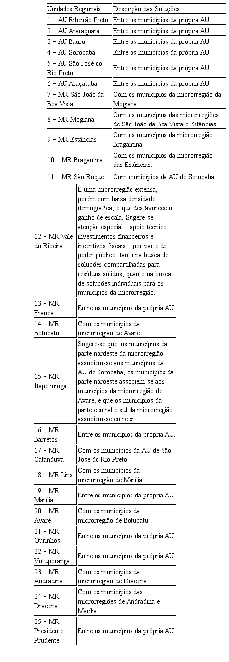 O PRS-SP ressalta ainda que a sugestão apresentada envolveu outros fatores como afinidades político-ideológicas, infraestruturas de tratamento e disposição finais já estabelecidos (SÃO PAULO, 2014). Dentre as sugestões presentes no PRS-SP para cada AU e Microrregiões (MR) selecionamos aqui as relativas às de agrupamento entre tais regiões conforme a Tabela 1.