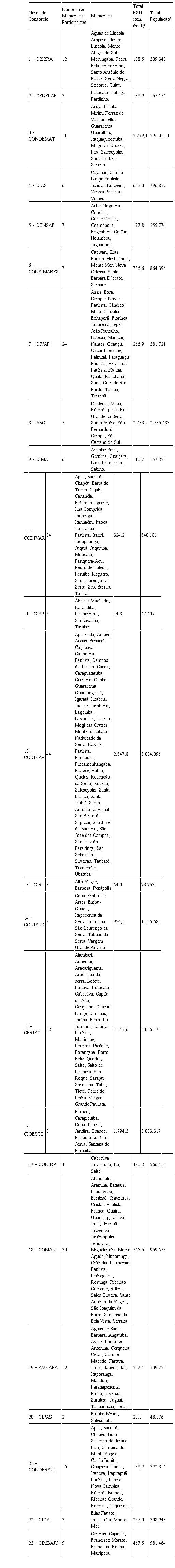 Após esse primeiro levantamento, e considerando que nenhu- ma dessas referências apresentava dados atualizados, foi confirmada a existência e efetiva atividade de cada um deles em 2016, por meio de pesquisas na internet e de contato telefônico com os municípios que integravam os consórcios identificados inicialmente. Essa ini- ciativa possibilitou constatar, efetivamente, que havia um total de 21 consórcios atuantes nessas atividades, o que será apresentado nos resultados deste trabalho.