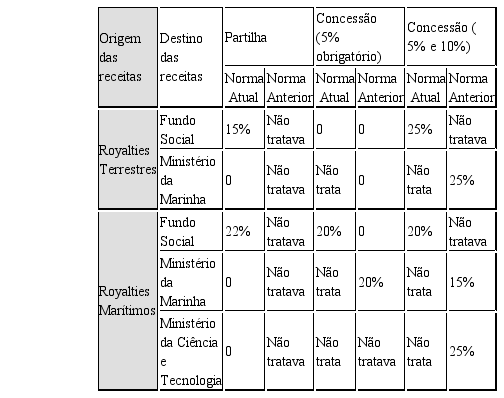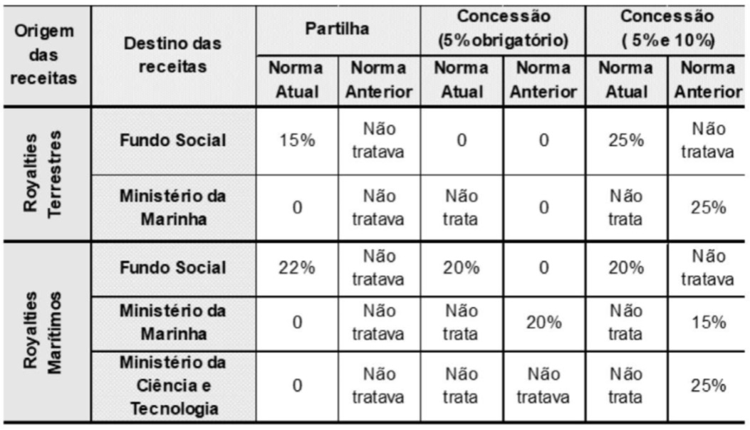 O art. 47º da Lei do Petróleo definia o montante de 10% da produção de petróleo e gás natural como valor a ser pago a título de royalties. Quanto aos valores excedentes a 5% da produção, as regras de distribuição que incidiam eram as do art. 49º dessa lei. No que tange à parcela de até 5% da produção (parcela não exce- dente a 5%), as regras de distribuição eram as constantes da Lei nº 7.990/1989. (BRASIL, 1989). Registrava-se, portanto, a existência de dois diferentes sistemas de distribuição dos recursos provenientes dos royalties de petróleo e gás natural sob o contrato de concessão. (COSTA, 2012).