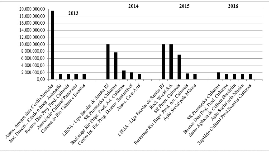 O Gráfico 2 traz os principais proponentes que tiveram seus projetos culturais aprovados pela CAP, nos editais da SEC de 2013 a 2016. Esse dado é importante porque além de ressaltar a concentração dos recursos da lei em alguns projetos, também mostra que esses proponentes encontram-se na cidade do Rio de Janeiro. Para a construção do gráfico 2 foram selecionados os cinco projetos culturais cujo valor aprovado fosse acima de R$ 1,5 milhão, em cada ano. Trata-se de um critério meramente analítico, sem nenhum rigor estatístico. Mais com a intenção de não tumultuar visualmente o gráfico com informações excessivas.