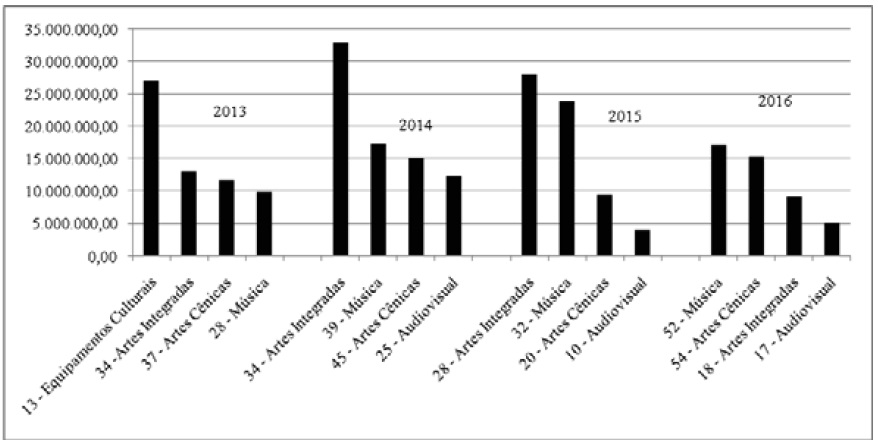 Esses projetos se concentram em áreas culturais. Ao longo desses quatro anos analisados observou-se uma concentração dos projetos aprovados e recursos de custeio. Por este último critério, como se observa no Gráfico 3, duas áreas se destacam, a música e a artes integradas. Juntas correspondem a quase 50% do volume de recursos destinados pela lei de incentivo à cultura no Rio de Janeiro.