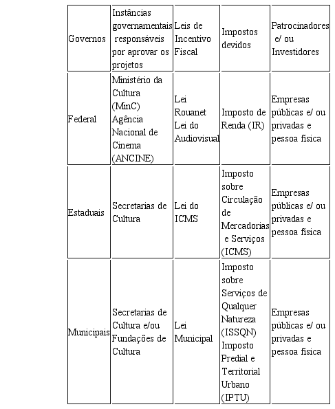 A dinâmica das leis de incentivo à cultura no Brasil ocorre em três etapas principais: na primeira, os governos federal, estaduais ou municipais aprovam os projetos submetidos; na segunda, os pro- ponentes (produtores culturais) captam os recursos no mercado e se responsabilizam junto ao governo pelos projetos; e, por último, os investidores/patrocinadores (empresa ou pessoa física) que aplicam seus recursos nesses projetos culturais aprovados passam a ter direi- to aos benefícios fiscais previstos nas respectivas leis de incentivo cultural.