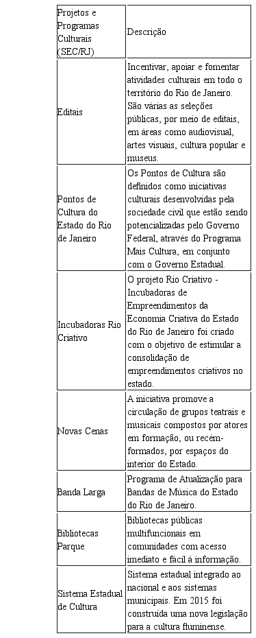 A Secretaria de Estado de Cultura do Rio de Janeiro (SEC) organiza a política cultural do estado a partir de projetos e programas culturais. Segundo informações da SEC, existe a figura normativa do Fundo Estadual de Cultura, mas que ainda não foi regulamentado. O desenho das políticas de cultura adotado pela SEC pode ser observado no Quadro 2.