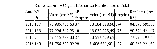 A Tabela 2 evidencia a relação quantitativa dos projetos aprovados pela Secretaria de Cultura do Rio de Janeiro, para os anos analisados. Os dados apresentados referem-se aos projetos que fo- ram aprovados, com os respectivos valores que podem ser captados, e que foram divulgados pelo DOERJ. Não significa, no entanto, que esses valores correspondem exatamente ao total orçado pelo projeto apresentado à SEC. Para essa tabela, os dados foram agrupados por projetos apresentados na capital e municípios do interior do estado.