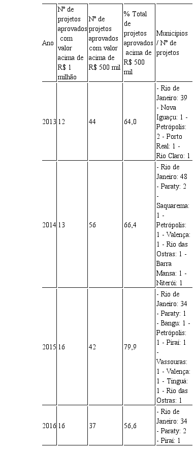 A Tabela 3 expande um pouco mais a análise efetuada acima. Traz um perfil dos projetos aprovados pela CAP por dois extratos de valores, além de apontar os municípios a que se destinam. Mais uma vez, percebe-se a concentração desses projetos no município do Rio de Janeiro, que responde, em média por 38,8% desses projetos aprovados. Dos demais municípios, pode-se falar de Paraty e Petró- polis que aparecem com projetos nessa faixa de valor, ao logo desses quatro anos analisados. Mas, nenhum município aprovou mais que dois projetos acima dos valores considerados por essa análise.