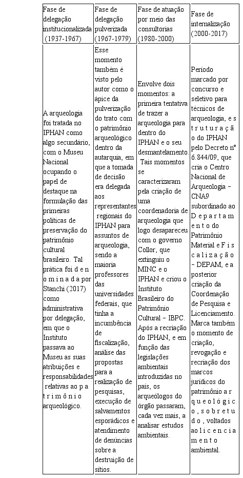 Em artigo publicado recentemente por Roberto Stanchi (2017) essa constatação fica bastante acentuada, quando ele divide a história das relações do IPHAN com a arqueologia em quatro fases: a de delegação institucionalizada, a de delegação pulverizada, a de atuação por meio das consultorias, e a de internalização, também observando dois momentos significativos, a exemplo da tentativa de incorporação da arqueologia e de seu desmantelamento, conforme síntese apresentada no Quadro 1.