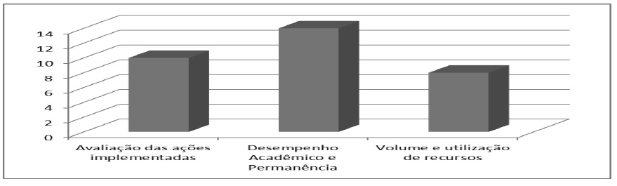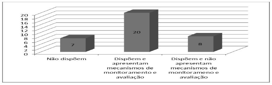 Do mesmo modo, é a previsão de monitoramento e avaliação em que, mesmo presente em 28 dos 35 Institutos (80%), em 28% deles não há qualquer previsão de como as ações serão acompanhadas e examinadas quanto à eficácia, eficiência ou efetividade. Nos que preveem, 50% planejam a instituição de uma comissão de avaliação e, em todos eles, a elaboração de relatórios, realização de reuniões entre órgãos gestores, ou entre gestores e beneficiários, tendo por base indicadores de desempenho acadêmico e permanência dos es- tudantes, as ações desenvolvidas, volume e utilização dos recursos.
