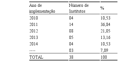 O Ministério da Educação recomendou, por meio do Ofí- cio nº 42, de 03 de maio de 2011, que os Institutos implemen- tassem as ações de assistência estudantil com o auxílio de uma regulamentação própria e avisou que os recursos para o custeio das ações seriam ampliados e alocados diretamente no orçamen- to das instituições. (BRASIL, 2011a). Isso, como se constata na Tabela 1, elaborada com base em levantamento realizado nos sites dos 38 Institutos Federais1, desencadeou o estabelecimento de nor- mas internas com as definições para a implementação do PNAES pela maioria (71%) das unidades de ensino entre 2011 e 2013.