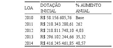 O aumento registrado em 2011 não se repetiu nos anos se- guintes. Desde então, as maiores elevações foram de 35,32% de 2012 para 2013 e de 40,57% de 2013 para 2014, quando alcançou o montante de R$ 416.245.461,85. (BRASIL, 2010b; 2011a; 2012; 2013; 2014).