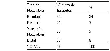 Com efeito, todas as unidades de ensino estabeleceram, a partir de então, algum tipo de regulamento disciplinando as ações de as- sistência estudantil, a maioria (84%), como exposto na Tabela 3, por meio de Resoluções aprovadas no Conselho Superior e os demais por Portarias (01), Instruções Normativas (02), ou mesmo só Editais, expedidos pela Reitoria, Pró-Reitorias, Colégio de Dirigentes e Conselho de Ensino, Pesquisa e Extensão e Diretorias Gerais.