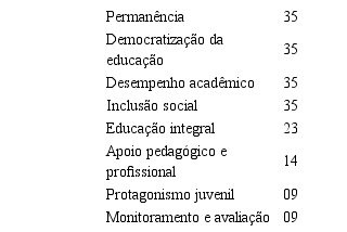 Nesses documentos, foram estabelecidos princípios, objetivos e ações. Os objetivos seguem, em geral, os elencados no art. 2º do Decreto, adaptando-os às suas necessidades ou ampliando o escopo de atuação. Assim, como se percebe na tabela 04, permanência, democratização da educação, desempenho acadêmico e inclusão social, previstos no Decreto, são adotados nas normativas de todos os Institutos (35). Já têm presenças distintas os objetivos voltados para educação integral (23), apoio pedagógico e profissional (14), protagonismo juvenil (09) e monitoramento e avaliação (09).