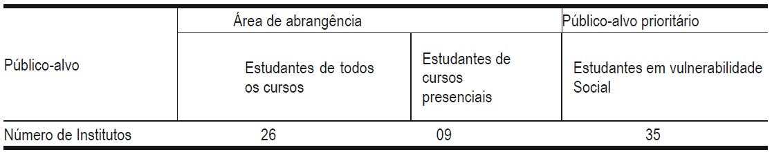 O público-alvo dessas ações, ainda que privilegiasse, como queria o Decreto, os estudantes em vulnerabilidade social, também se diferenciava; ora todos os estudantes, inclusive os dos cursos na modalidade de educação à distância e de jovens e adultos ao lado dos matriculados na Educação Básica, em suas várias modalidades, e no ensino superior; ora apenas os matriculados em cursos regula- res e presenciais. Com isso, ao mesmo tempo em que focalizavam as ações, direcionando-as para aqueles em vulnerabilidade social, atendiam todos, independente do curso, da modalidade de ensino e da condição socioeconômica.