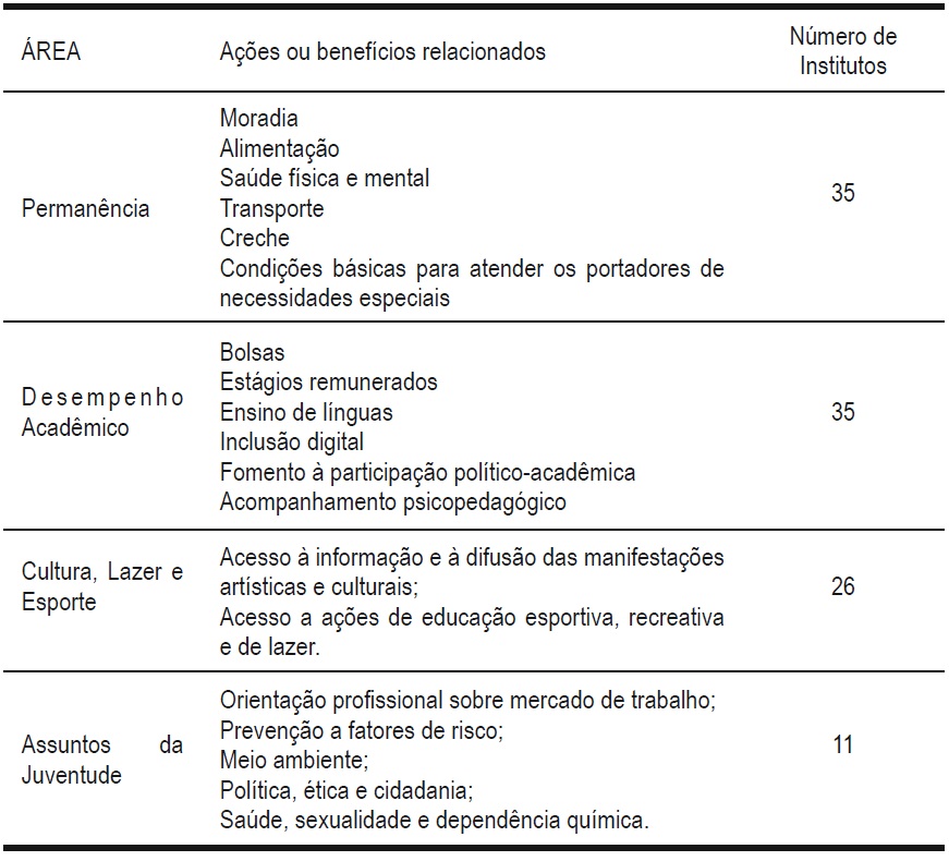 [...] as ações de assistência estudantil serão executadas por insti- tuições federais de ensino superior, abrangendo os Institutos Fe- derais de Educação, Ciência e Tecnologia, considerando suas es- pecificidades, as áreas estratégicas de ensino, pesquisa e extensão e aquelas que atendam às necessidades identificadas por seu corpo discente. (BRASIL, 2010a).