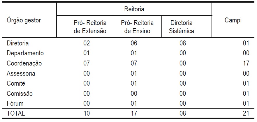 A gestão das ações ficou a cargo, na maioria dos Institutos, de Diretorias vinculadas à Pró-Reitoria de Ensino e, nos campi, sob a responsabilidade de Coordenações, mas há também, dentre outros, departamentos, coordenações, assessorias, evidenciando status diferenciado da ação no interior da organização e, consequentemente, expressando o lugar dado à assistência estudantil na efetivação das finalidades da escola.