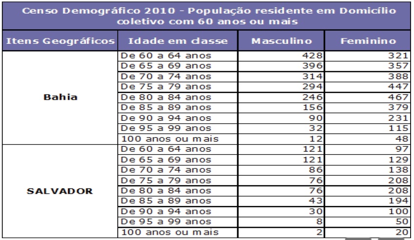 Entretanto, diante das mudanças demográficas acerca do envelhecimento, na qual a feminização da velhice despontou no país, onde cada região apresenta sua especificidade frente à temática, abordaremos a Bahia como referente do munícipio de Salvador, consoante a institucionalização das pessoas idosas, como veremos no quadro 1 extraído do último censo nacional (INSTITUTO BRASILEIRO DE GEOGRAFIA E ESTATÍSTICA, 2011), a seguir: