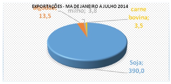 Os dados mais recentes da economia maranhense corroboram com o que definiu Picoli, uma vez que o Maranhão segue tendo lugar de destaque no ranking de Valor Bruto da Produção agropecuária (VBP) nordestina, um crescimento superior a 10% em 2014 em relação ao ano anterior, segundo informações do Jornal do Estado do Maranhão (MA..., 2015), destacando a soja como maior participação. Ilustraremos esse quadro tomando como referência os dados de exportação conforme segue.
