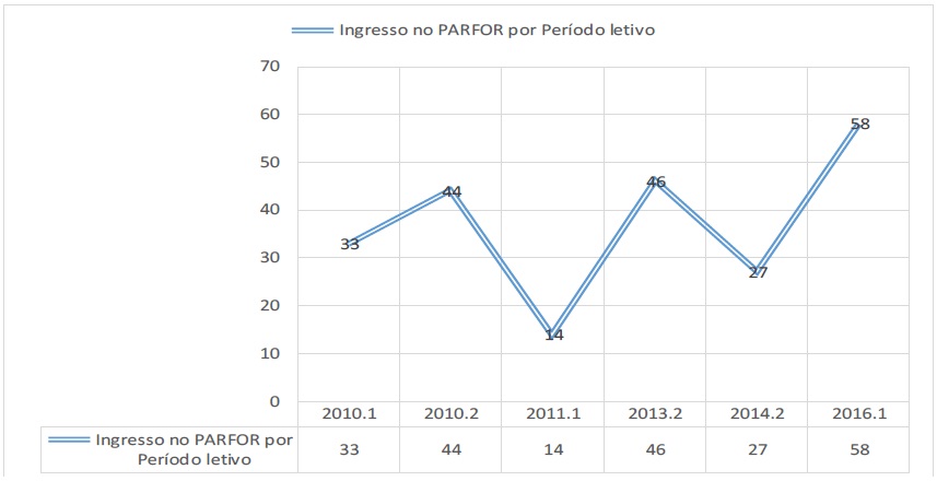 O PARFOR é implantado no curso de Pedagogia do Instituto Multidisciplinar da UFRRJ a partir do primeiro semestre de 2010. Na primeira turma, com seleção realizada via Plataforma Paulo Freire (Disponível em:https://freire2.capes.gov.br), vinculada e administrada pela CAPES, foram selecionados 33 professores / educandos. Curiosamente essa não seria uma média constante, em cada um dos 6 (seis) semestres (2010.1, 2010.2, 2011.1, 2013.2, 2014.2, 2016.1), em relação aos que ingressaram pelo PARFOR, os números variaram de modo absurdo como mostra o gráfico abaixo.