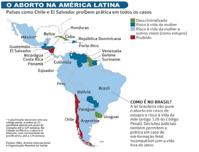 Atualmente, na América Latina, apenas Cuba, Porto Rico, Guiana e Uruguai permitem o aborto de modo irrestrito. A Argentina acabou de dar o primeiro passo em avanço à legalização do aborto, com aprovação na Câmara, e apenas Chile, El Salvador e Nicarágua seguem proibindo irrestritamente o abortamento. Todos os demais países permitem o aborto com restrições, mormente nos casos de gravidez resultante de estupro e risco a vida da mulher. (UNITED NATIONS, 2011).