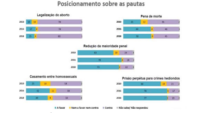 Pelo estudo, pode-se perceber que 80% dos brasileiros são contra o aborto; metade dos brasileiros se declaram a favor da pena de morte, 73% opinam pela positividade da redução da maioridade penal, 50% são contra o casamento de pessoas homoafetivas e 77% admitem a prisão perpétua para crimes hediondos. É um cenário alarmante, principalmente quando esse estudo é considerado em conjunto, apontando que em 2018, 55% dos brasileiros são classificados como conservadores em alto grau. A figura a seguir traz os resultados aferidos pela pesquisa, com relação a cada uma das pautas usadas para definição do grau de conservadorismo do brasileiro.