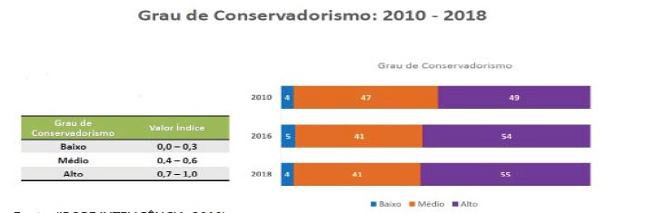 O percentual dos entrevistados que disse ser contra o aborto foi o maior percentual observado desde 2010. O nível de conservadorismo também teve pequeno crescimento, classificando o brasileiro como médio conservador, embora muito perto do percentual considerado como conservadorismo alto. O gráfico a seguir compara o nível de conservadorismo no Brasil entre os anos de 2010 a 2018, em percentuais da população: