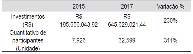 Para que se possa ter uma melhor percepção acerca do potencial de acúmulo monetário da Funpresp-Exe, a Tabela 1 apresenta dados relacionados ao comportamento do montante dos investimentos e do quantitativo de servidores participantes no período entre setembro de 2015 - antes da determinação do mecanismo da adesão automática – e setembro de 2017. Conforme é possível observar, a imposição do mecanismo coercitivo da adesão automática engendrou um crescimento gigantesco do quantitativo de servidores vinculados à Funpresp-Exe, configurando uma expansão da ordem de 311%, ou seja, o número de servidores quadruplicou, passando de, aproximadamente, 8 mil em setembro de 2015 para alcançar o quantitativo de mais de 32 mil em setembro de 2017. No passo dessa expansão, a magnitude monetária dos investimentos do fundo de pensão em análise triplicou, alcançando uma elevação extraordinária, de 230%.