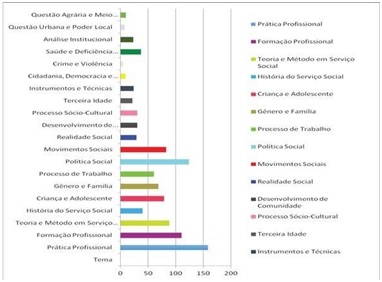 Em seu trabalho sobre a produção de conhecimentos em Serviço Social, Kameyana (1998) indica os temas apresentados no Gráfico 1.