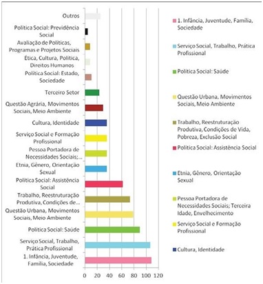 As autoras destacam o eixo temático Política Social (nas suas diferentes expressões), que representou 21,6% das teses e dissertações. Se compararmos aos dados da pesquisa de Kameyana (1998) (12,9%), registramos um crescimento do tema. É mister associarmos esse crescimento a dois fatos: a expansão dos cursos de Pós-Graduação em Política Social e Políticas Públicas na área (cursos da Universidade de Brasília - UnB e da Universidade Federal do Maranhão - UFMA) e o período pós-aprovação da Constituição de 1988 (com aprovação do Sistema Único de Saúde - SUS, o debate da Política Nacional de Assistência Social - PNAS, entre outros). Destaca-se aqui o crescimento observado na produção dessas duas políticas.