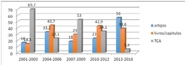 O crescimento quantitativo e qualitativo progressivamente aparece na publicação em livros, a qual variou entre 14,3% (2001- 2003) e 43,7% (2004-2006). Esse crescimento acompanha a expansão dos Programas da área, ocorrida a partir do ano de 2001 (Gráfico 3).