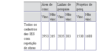 - ausência de articulação entre as obras e a área de concentração, linhas de pesquisa do programa e os projetos de pesquisa dos docentes (Tabela 1).