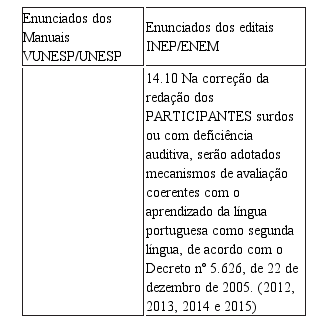 Quanto aos Editais do INEP, todas as edições investigadas mencionam a utilização de mecanismos específicos na correção da redação dos participantes surdos ou com deficiência auditiva, garantindo conformidade com o Decreto nº 5.626/2005. Porém, no Anexo IV dos Editais investigados, que trata da Correção da Redação, constam apenas os critérios gerais de correção referindo-se a cinco competências que são avaliadas em cinco níveis de domínio linguístico, sendo elas: I - Demonstrar domínio da modalidade escrita formal da língua portuguesa; II - Compreender a proposta de redação e aplicar conceitos das varias áreas de conhecimento para desenvolver o tema, dentro dos limites estruturais do texto dissertativo-argumentativo em prosa; III - Selecionar, relacionar, organizar e interpretar informações, fatos, opiniões e argumentos em defesa de um ponto de vista; IV - Demonstrar conhecimento dos mecanismos linguísticos necessários para a construção da argumentação. e V - Elaborar proposta de intervenção para o problema abordado, respeitando os direitos humanos.