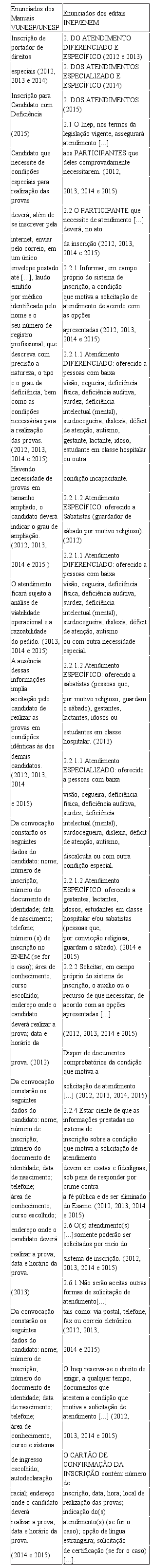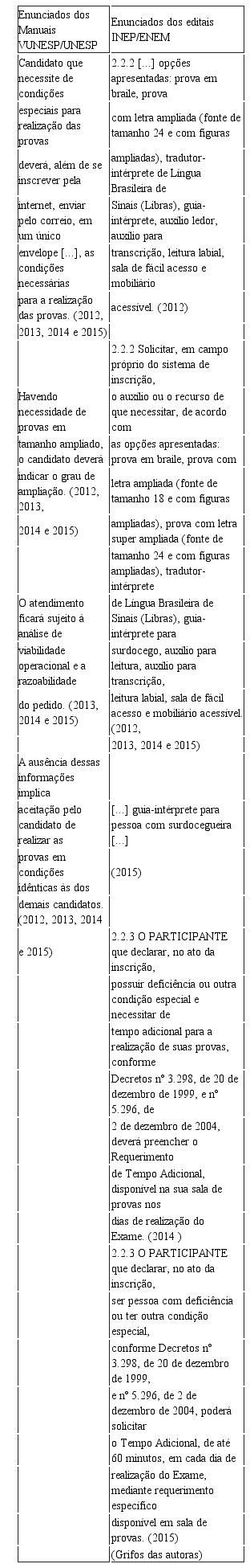 Para organizar os enunciados selecionados nos Manuais e Resoluções (VUNESP, 2012 - 2015) e nos Editais (INEP, 2012 - 2015) foram elaboradas três tabelas com o objetivo de contemplar três temas que caracterizam a etapa de ingresso ao ensino superior por meio dos processos seletivos, a saber: (1) critérios para inscrição dos candidatos com deficiência, (2) recursos e adaptações razoáveis disponibilizados para a realização das provas e (3) critérios adotados para correção das provas dos candidatos com deficiência.