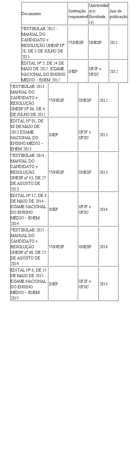 Para coletar os documentos que oficializam o Concurso Vestibular da UNESP e o ENEM, consultamos os portais eletrônicos da VUNESP e do INEP. No estudo, incluímos as edições de 2012 a 2015 em função da disponibilização dos arquivos no portal da VUNESP somente a partir da edição 2012. Cabe esclarecer que a VUNESP opta pela publicação de Resoluções e Manuais, enquanto o INEP faz uso de Editais, e que os textos publicados cumprem a função de estabelecer as normas para realização dos processos seletivos das IES investigadas e divulgá-los oficialmente.