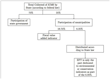 No Brasil, as Transferências Fiscais Ecológicas têm como base a repartição do ICMS. De acordo com a Constituição Federal do Brasil, artigo 155º, esse imposto é de competência dos estados, e, conforme artigo 158, parte do que é arrecadado do mesmo deve ser obrigatoriamente transferido para os municípios. A Figura 1 demonstra como esta distribuição deve ser feita.