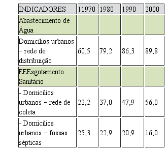 De acordo com a Pesquisa Nacional de Saneamento Básico- PNSB, os índices de atendimento pelos serviços de abastecimento de água, por meio de ligações domiciliares às redes, alcançaram, em 2000, o percentual de 89,8% dos domicílios urbanos. No que se refere ao esgotamento sanitário, apenas 56% destes domicílios estão ligados às redes coletoras (exclusivas ou conectadas a drenagem pluvial), número que se eleva para 62,0% quando se considera a solução de tratamento em fossa séptica como adequada. Assim, o déficit de abastecimento de água atinge os 10 milhões de domicílios, e mais de 30 milhões não estão conectados às redes coletoras de esgotos.