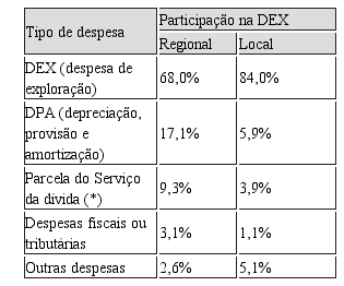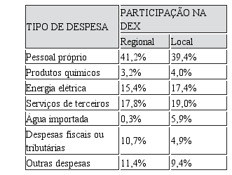 A composição das despesas totais dos serviços é, para efeito de apropriação desagregada nos tipos: despesas de exploração (DEX); depreciação, provisão e amortização (DPA); serviço da dívida; despesas ficais ou tributárias; e outras despesas. No Quadro a seguir estão os percentuais por tipo de despesa para as CESBs e serviços locais.