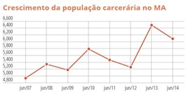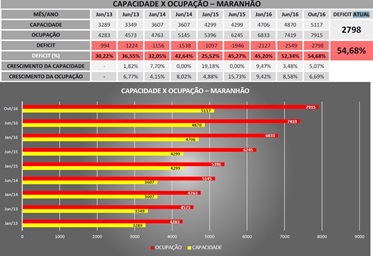 A taxa de ocupação era de 7.915 presos, para 5.117 vagas. Em janeiro de 2015 houve pequena diminuição do déficit de vagas (passou-se a 25,52%), devido à construção de novas unidades prisionais. Entretanto, em junho de 2015 se verifica um crescimento abrupto da quantidade de presos (de 5.396 para 6.245), gerando um déficit de 45,27% de vagas. (MARANHÃO, [2017]) 6.