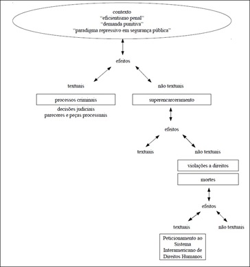 O encadeamento de efeitos sociais, ou seja, a forma como cadeias textuais e não textuais geram efeitos, pode ser analisado na materialização discursiva dos processos criminais daqueles mortos em Pedrinhas. Assim, compreendo o processo penal como um sistema de condições históricas que possibilitam “[...] o aparecimento dos enunciados como acontecimentos singulares.” (FOUCAULT, 2008, p. 147). As 15 mortes que geraram o peticionamento à CIDH e posterior condenação do Brasil na Corte Interamericana de Direitos Humanos são acontecimentos singulares (eventos) que se conectam ao contexto em que foram produzidas. A análise dos fluxos processuais-institucionais, a partir da atuação encadeada entre polícia, poder judiciário e penitenciária, vai no sentido da proposição de Vera Andrade: “Há polícias que matam e há prisões que matam. Uma sentença condenatória à pena de prisão representa hoje uma sentença condenatória ao risco da pena de morte indireta” (ANDRADE, 2012, p. 167-168).