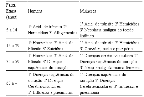 A Tabela 1 apresenta as três principais causas de morte no Brasil em 2014, segundo faixa etária e sexo, segundo estudo realizado pelo MS divulgado em 2017: