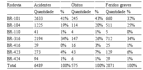 A Tabela 2 apresenta a quantidade total e o percentual de acidentes, óbitos e feridos graves ocorridos nas rodovias federais no estado de Alagoas, entre janeiro de 2013 a julho de 2017. Nela, pode-se identificar a BR-101 como onde mais foram registrados acidentes (2.633) e óbitos (245), enquanto que ocupa a segunda posição com 32% do total de feridos graves, apenas dois pontos percentuais abaixo da primeira colocada.