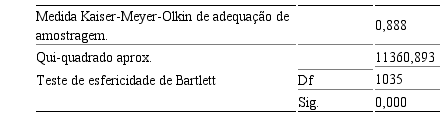A Tabela 3 apresenta o resultado do teste KMO e de esfericidade de Bartlett. Resultados do teste KMO acima de 0,8 indica uma adequação muito boa da amostra, enquanto que o desejável para o teste de Bartlett é que seu valor seja muito próximo de zero, constatados para o caso em estudo. (HAIR JR et al., 2005a).