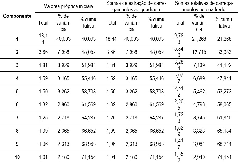 A Tabela 4 apresenta a variância total explicada por cada componente ou fator considerado. Através dela, constata-se que as 46 variáveis foram reduzidas a 10 componentes principais, cujos autovalores são superiores a 1,00 e que a porcentagem de variância explicada por eles é de 71,15% da variância total.