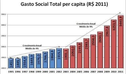 E de fato esses movimentos, em aliança ou confronto com os partidos e governantes eleitos, lograram vitórias parciais, que se revelam na gradual expansão da despesa social e com uma moderada redução das desigualdades, em especial sob os governos encabeçados pelo PT (2003-2016), que de fato fez crescer as despesas sociais num ritmo superior aos governos anteriores (Figura 1)