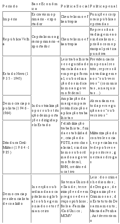 O simples transplante das análises sobre a relação entre trabalho e punição nos países capitalistas centrais (DI GIORGI, 2006; FOUCAULT, 2013; RUSCHE; KIRSCHHEIMER, 1999; YOUNG, 2002; WACQUANT, 2007) seria uma violência aos fatos da realidade brasileira. No entanto, é possível tomar tais análises como hipóteses a serem contrastadas e reformuladas no contexto brasileiro. Não se trata de um procedimento que duplica a divisão centro/periferia numa esfera intelectual, com os países centrais como produtores de teorias sociais, e os pesquisadores das regiões periféricas como testadores locais. O procedimento, pelo contrário, busca uma reformulação e invenção, apontando os limites das referidas análises, como também suas potencialidades heurísticas, buscando construir uma concepção mais abrangente da relação entre trabalho e punição nas sociedades capitalistas. Tentamos resumir a trajetória político-penal na Tabela 1.