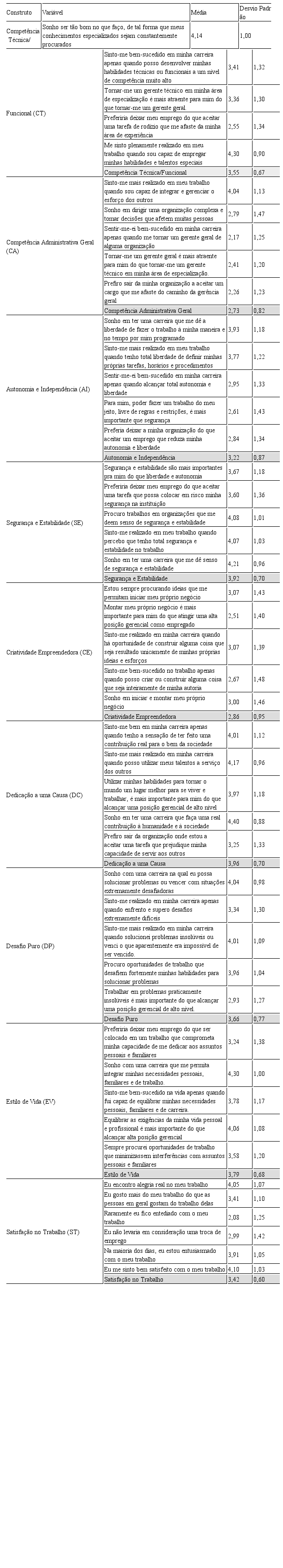 A partir das respostas às variáveis que procuraram estabelecer o grau de importância dada pelos respondentes às âncoras de carreira, observaram-se médias e desvios padrão apresentados na Tabela 2.