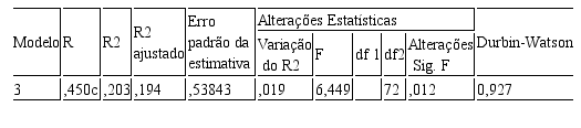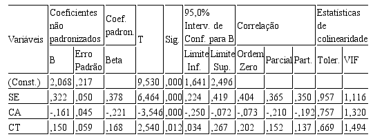 Ao analisar os modelos de regressão com todas as variáveis independentes pelo método stepwise, foi obtido um modelo com três construtos significantes para um intervalo de confiança de 99%: SE - Segurança e Estabilidade, CA - Competência Administrativa Geral; e CT - Competência Técnica/Funcional.