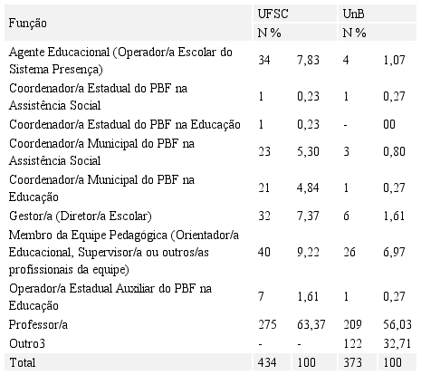 Inicialmente, cabe destacar que os cursos foram ofertados para públicos específicos, conforme pode ser observado na Tabela 1. A função foi indicada pelos/as cursistas no ato da matrícula. Também é necessário deixar claro que, ao responderem ao questionário, os/as participantes aceitaram, conforme previsto no próprio instrumento, a publicação dos dados, garantido o sigilo individual, após a sistematização feita pelas equipes gestoras dos cursos. No caso da UFSC, do total de 499 matriculados/as, 434 responderam. No caso da UnB, a resposta foi dada por 374 dos/as 452 matriculados/as.