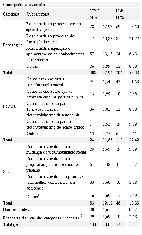 No caso da UFSC, a categoria “política” totalizou 21,66% e no caso da UnB, 29,49%. Considerando as subcategorias relacionadas, no caso da UFSC, a concepção de “educação como instrumento para a formação cidadã e desenvolvimento da autonomia” foi indicada por 7,83%, seguida das subcategorias “educação como caminho para a transformação social”, 5,54%, “como direito social que se expressa em uma política pública”, 2,99% e “como instrumento para o desenvolvimento do censo crítico”, 2,53%. No caso da UnB, os/as cursistas que compreendiam a “educação como caminho para a transformação social” totalizaram 11,43%, seguidos daqueles/as que a compreendiam como “instrumento para a formação cidadã e desenvolvimento da autonomia”, 8,58%, como “instrumento para o desenvolvimento do censo crítico”, 5,09%, e como “direito social que se expressa em uma política pública”, 2,68%.